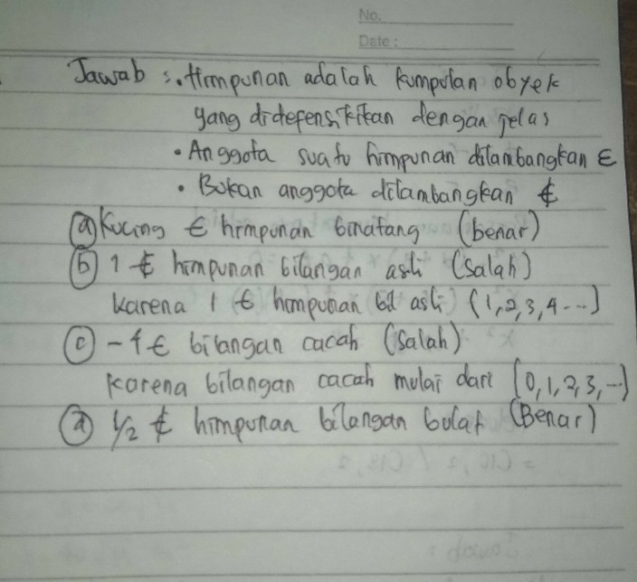 Kumpulan lukisan yang indah bukan Himpunan 2. Csalah karena bilangan cacah tidak negatif bilangan cacah di mulai dari 0123dst. 1 himpunan bilangan asli.